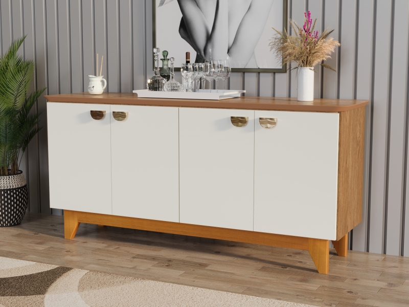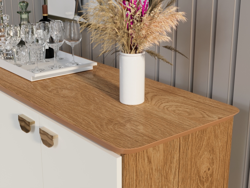 O balcão Suécia é um móvel elegante e funcional, ideal para compor ambientes modernos e sofisticados. Fabricado com caixa em MDF de 15mm e pés em madeira maciça, combina resistência e beleza. Seu acabamento conta com pintura UV, disponível na versão com tampo sem vidro ou com vidro de 4mm colado de fábrica, proporcionando praticidade e requinte. O design contemporâneo é complementado por alças metálicas douradas, que se destacam no visual clean e minimalista. Versátil, é perfeito para organizar utensílios ou acessórios, sendo uma excelente escolha para salas de estar ou áreas de jantar.