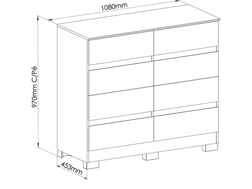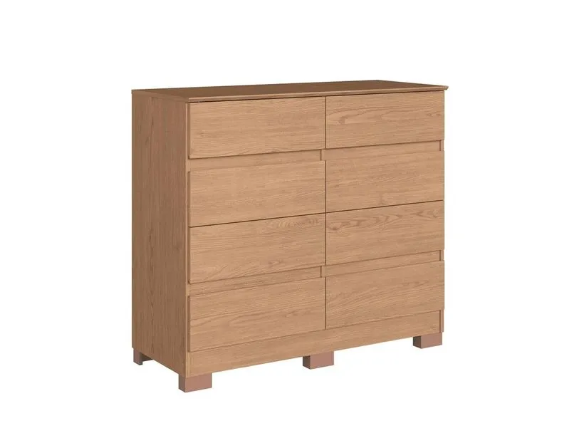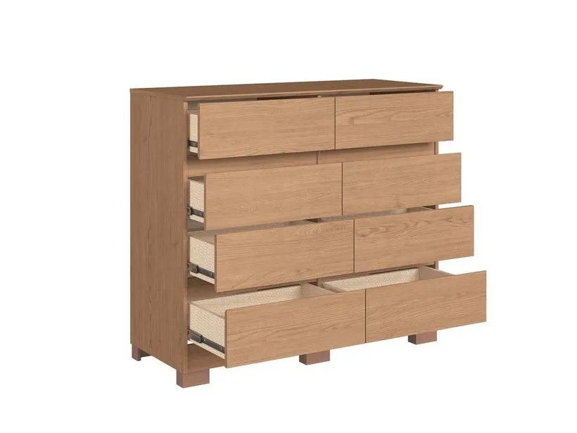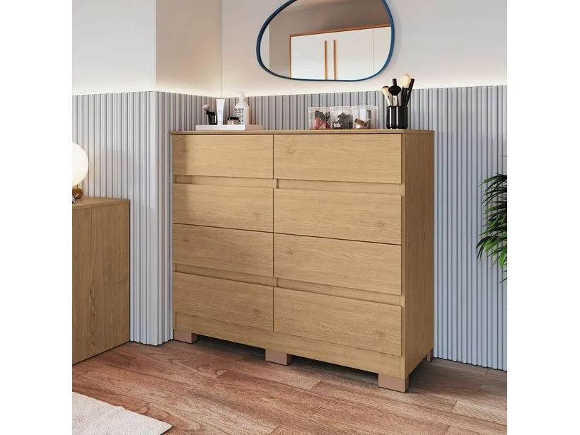 A cômoda Lara é resistente, com estrutura em MDP e fundos em MDF de 3mm para maior durabilidade. Possui 8 gavetas espaçosas com corrediças telescópicas facilitando a abertura. Os pés acompanham o produto, proporcionando estabilidade. Tampos, portas e gavetas com acabamento em 45º, conferindo um visual moderno e elegante ao móvel.