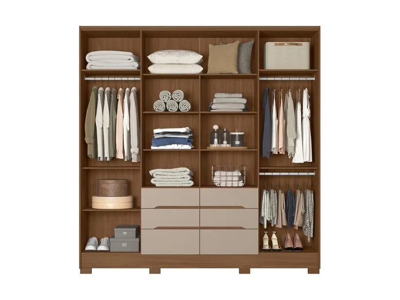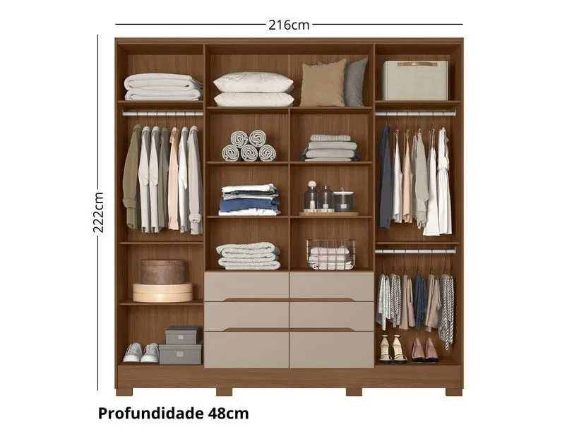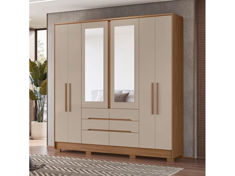 Guarda Roupa Casal com Espelho 6 Portas 6 Gavetas e Pés San Francisco Moval, o design se destaca pela elegância. O móvel conta ainda com cabideiros e calceiros em alumínio, garantindo resistência e funcionalidade. Espelhos estão inclusos, adicionando um toque de sofisticação. As portas apresentam detalhes frisados, enquanto os maleiros espaçosos oferecem ampla capacidade de armazenamento.